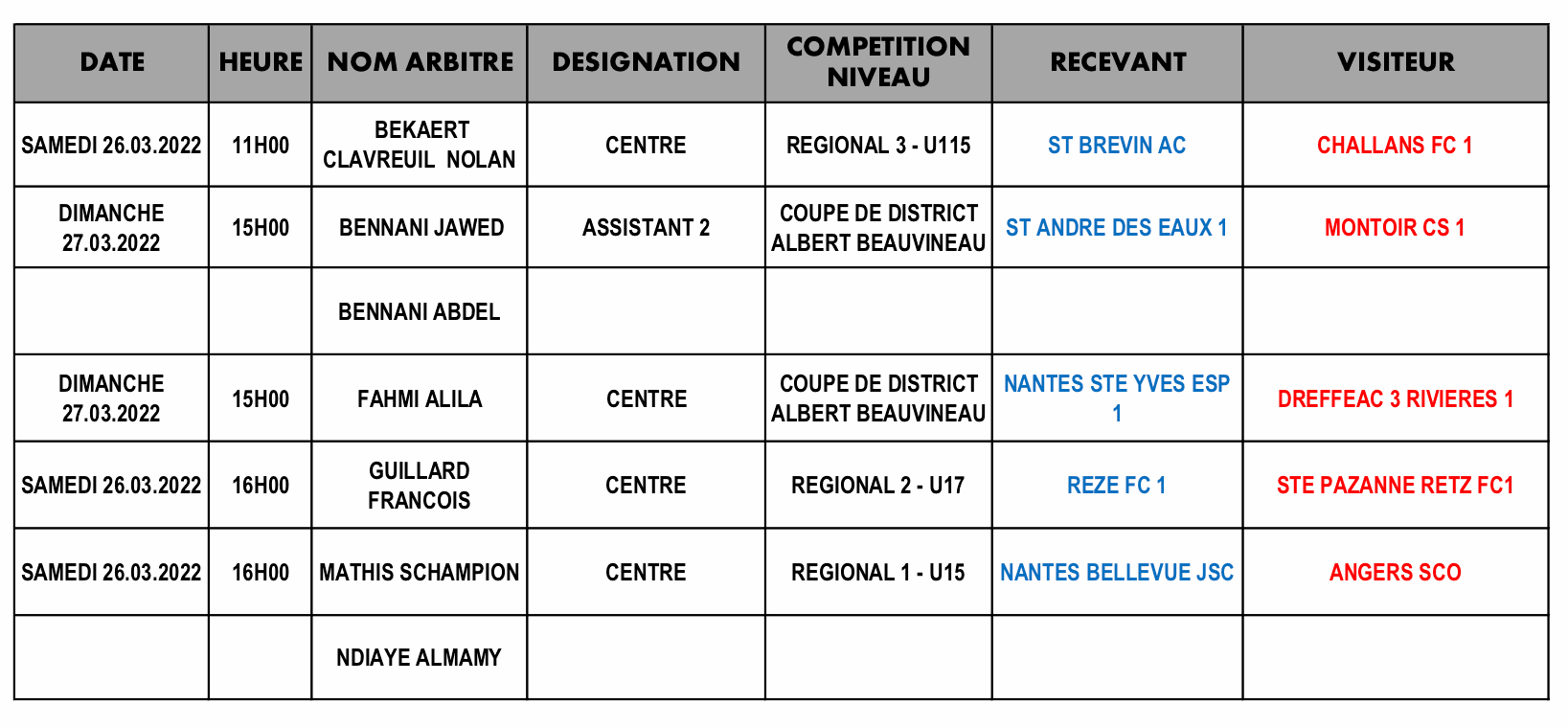 Voici où sont nos arbitres ce week-end du 26-27 Mars 2022 :